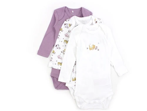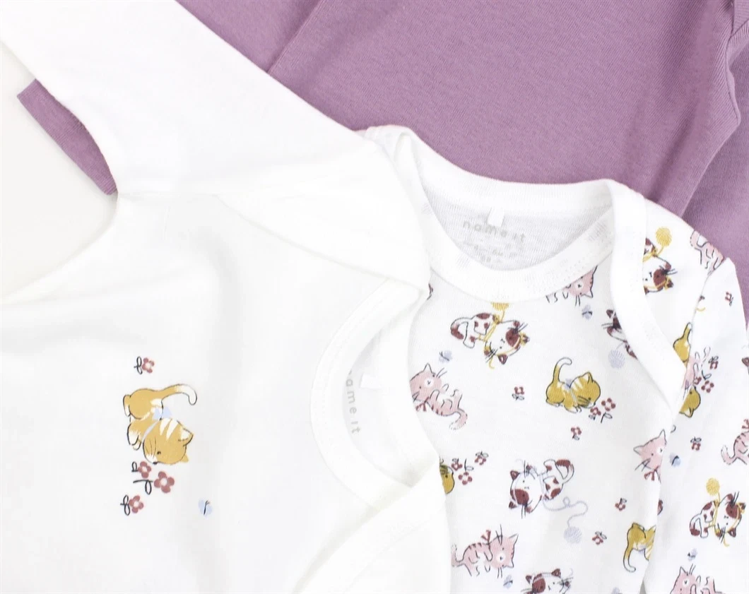 Den lilla body er ensfarvet mens de to hvide bodyer har katte-print.