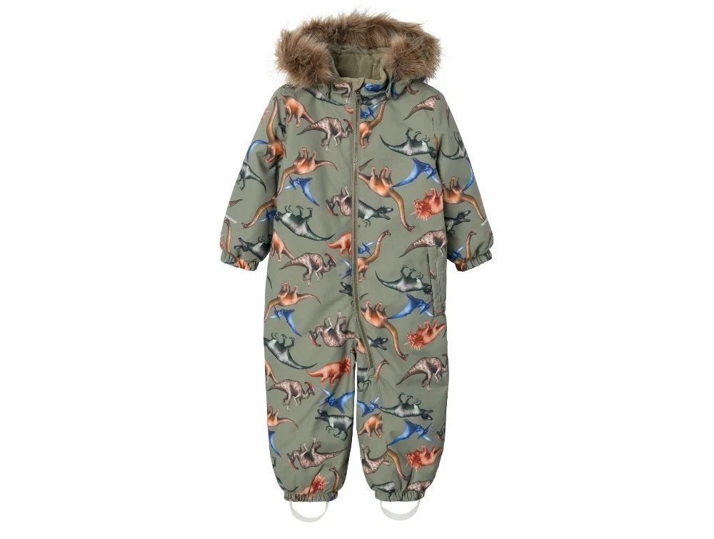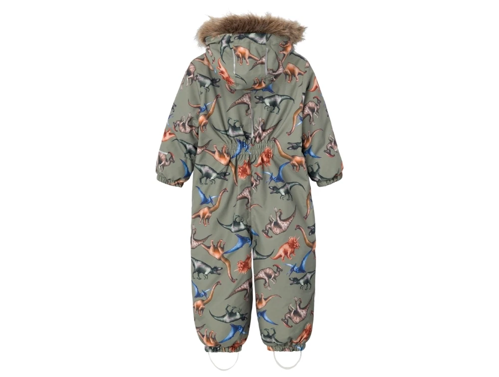 Flyverdragt i farven vetiver med dinoprint fra Name It. Flyverdragten har en aftagelig hætte med faux fur og trykknapper.
