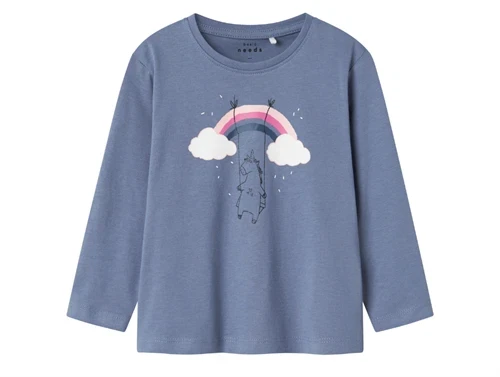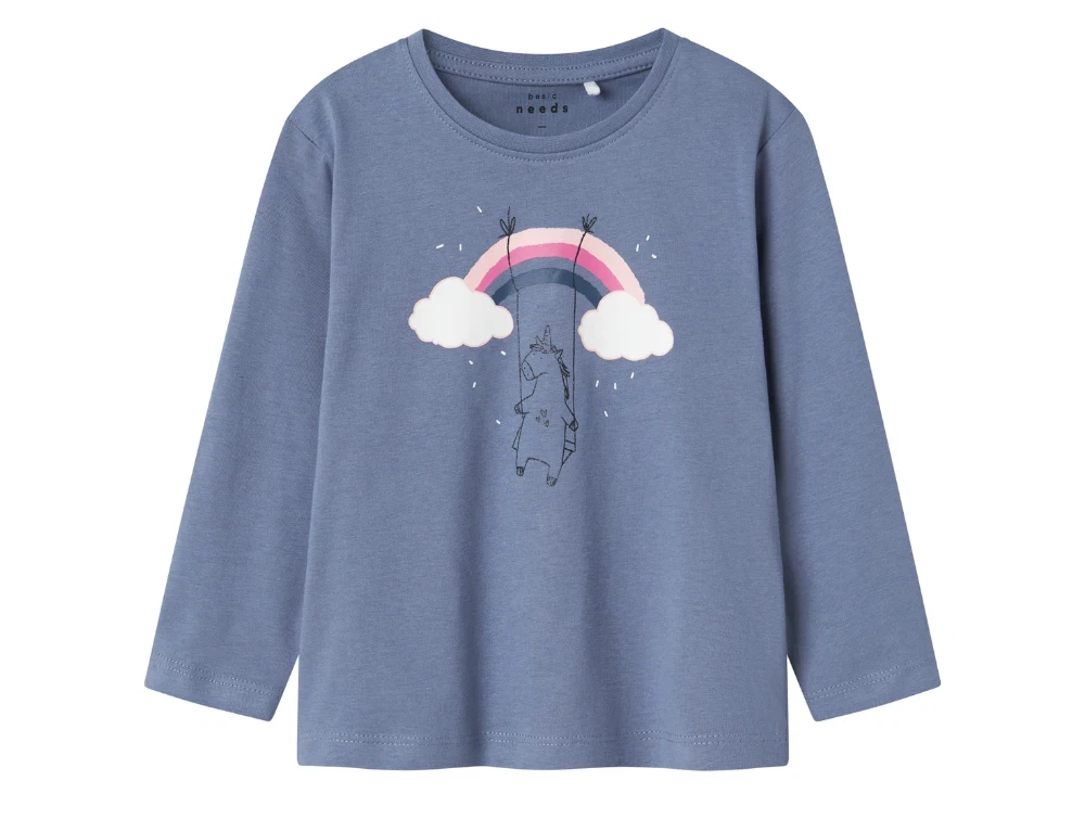 Langærmet top i farven wild wind med regnbue og enhjørning på gynge fra Name It.