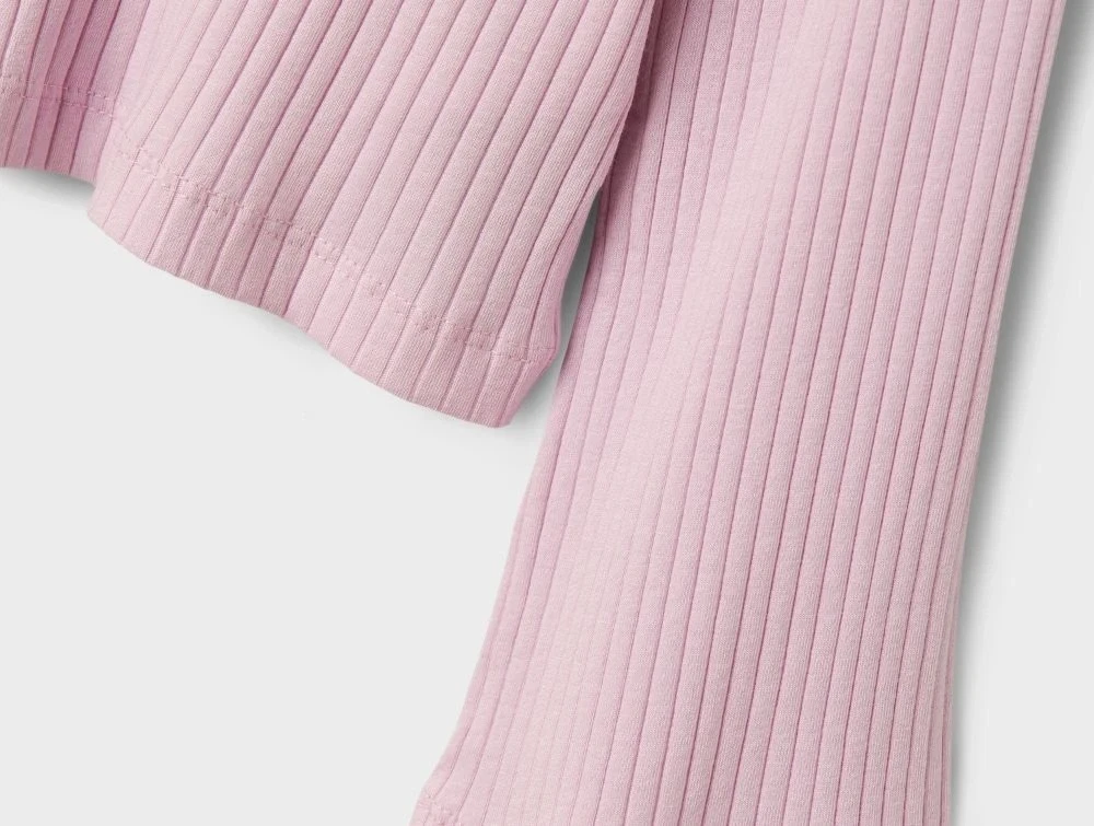 Kort lyserød top fra Name It i rib med lange trompetærmer.