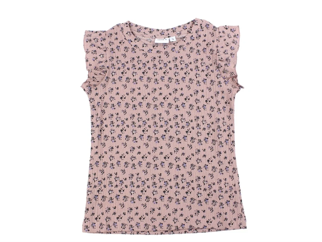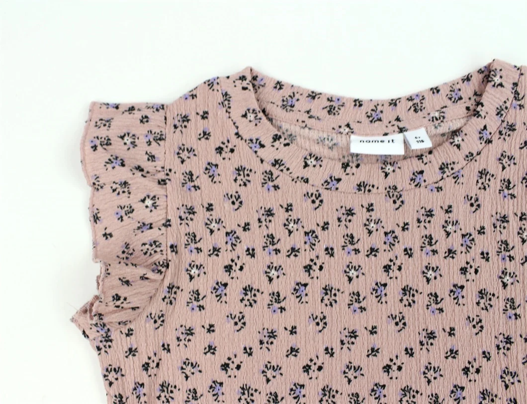 Skøn top i struktureret materiale med sød flæsedetalje og blomsterprint fra Name It.