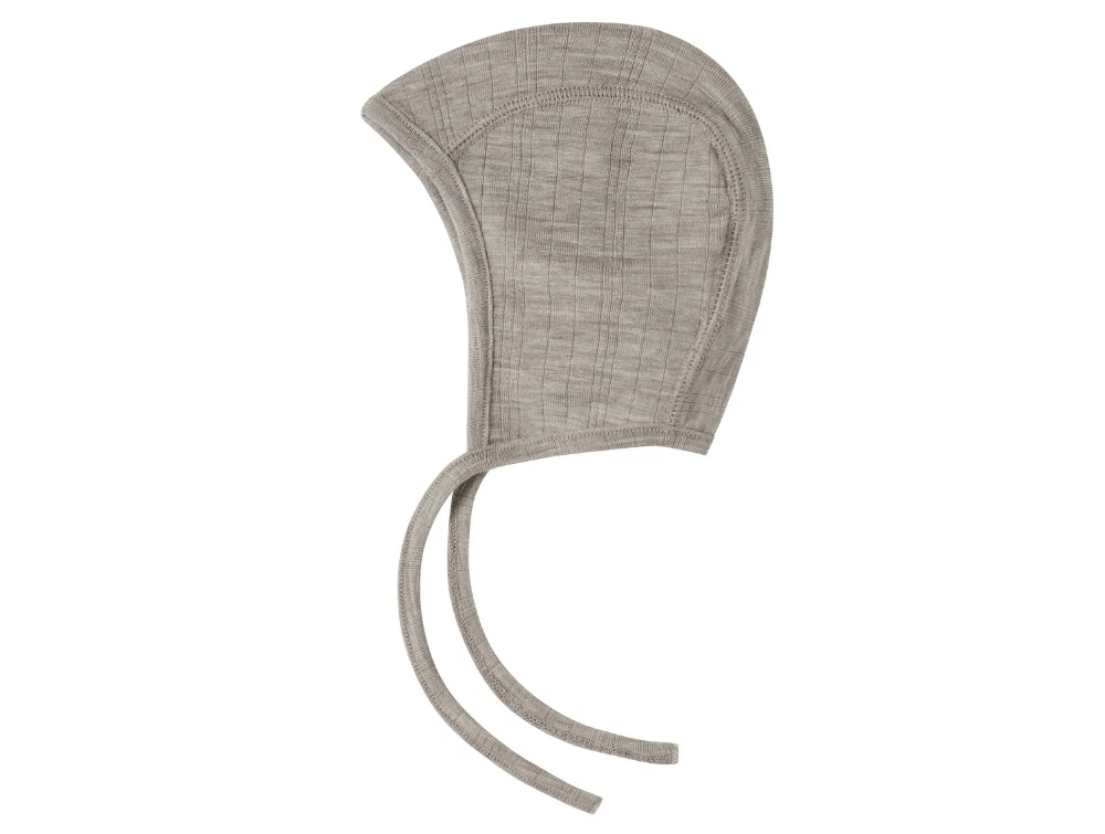 Den er strikket i blød merinould med diskret ribstruktur og har bindebånd under hagen for en sikker pasform.