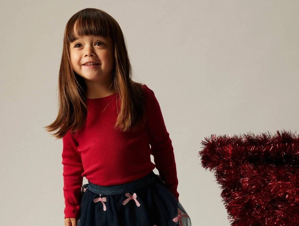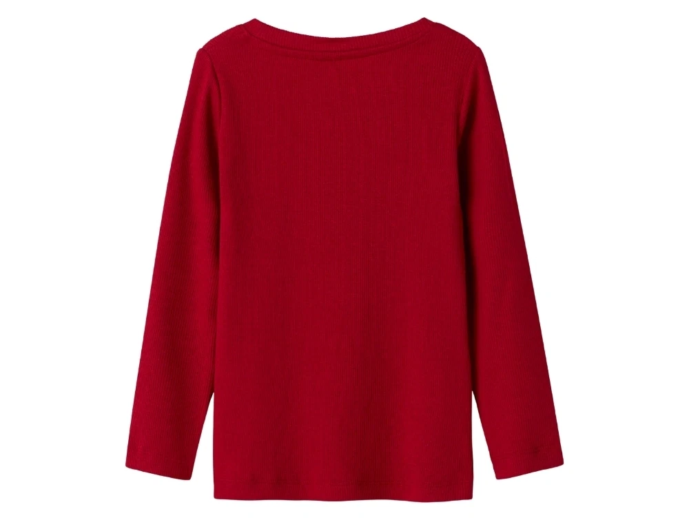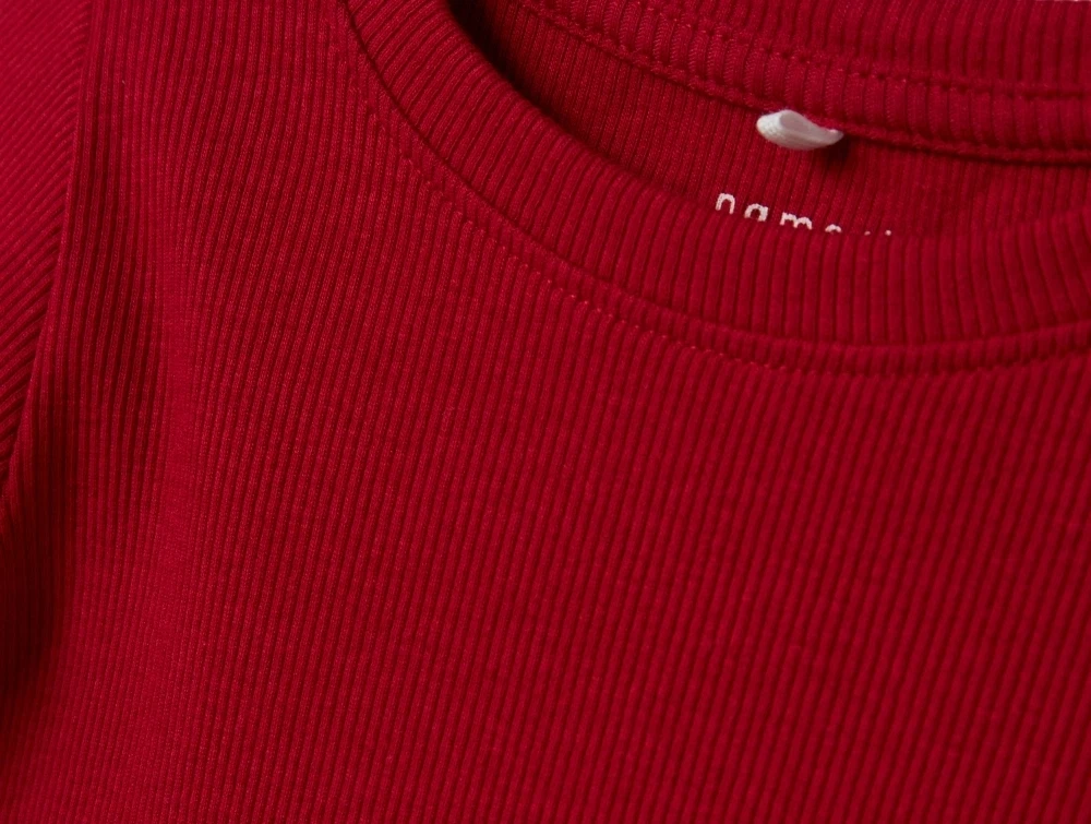 Barn i rød Name It top med lange ærmerName It top jester red med lange ærmerDetalje af ribstrikket rød top fra Name ItBagside af jester red top fra Name It med lange ærmer