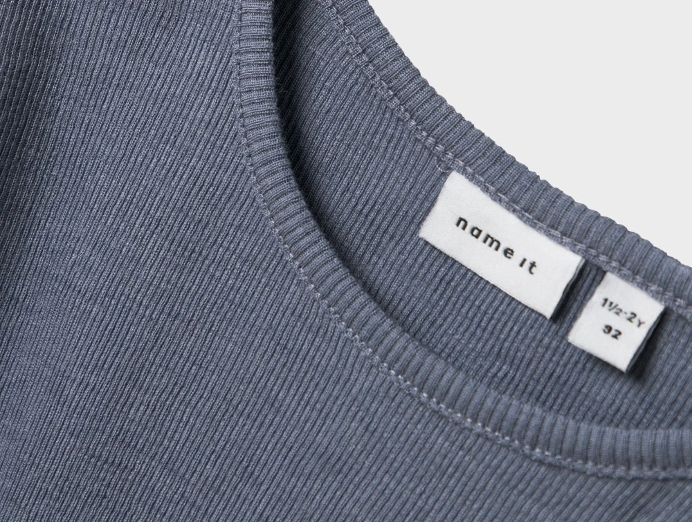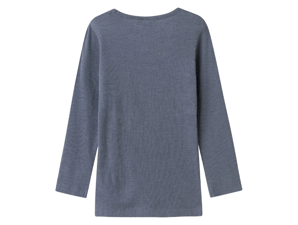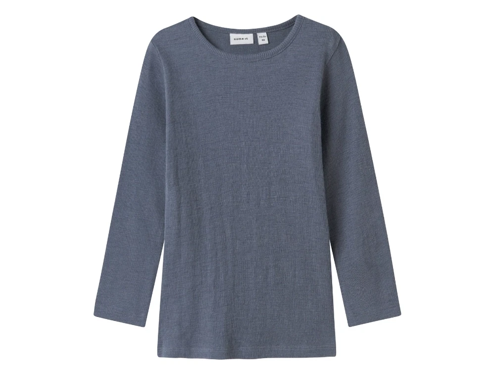 Name It top i gråblå nuance i merinould/silke med lange ærmerName It top i merinould/silke i gråblå nuance set tæt påName It top i folkstone gray med lange ærmer set bagfra