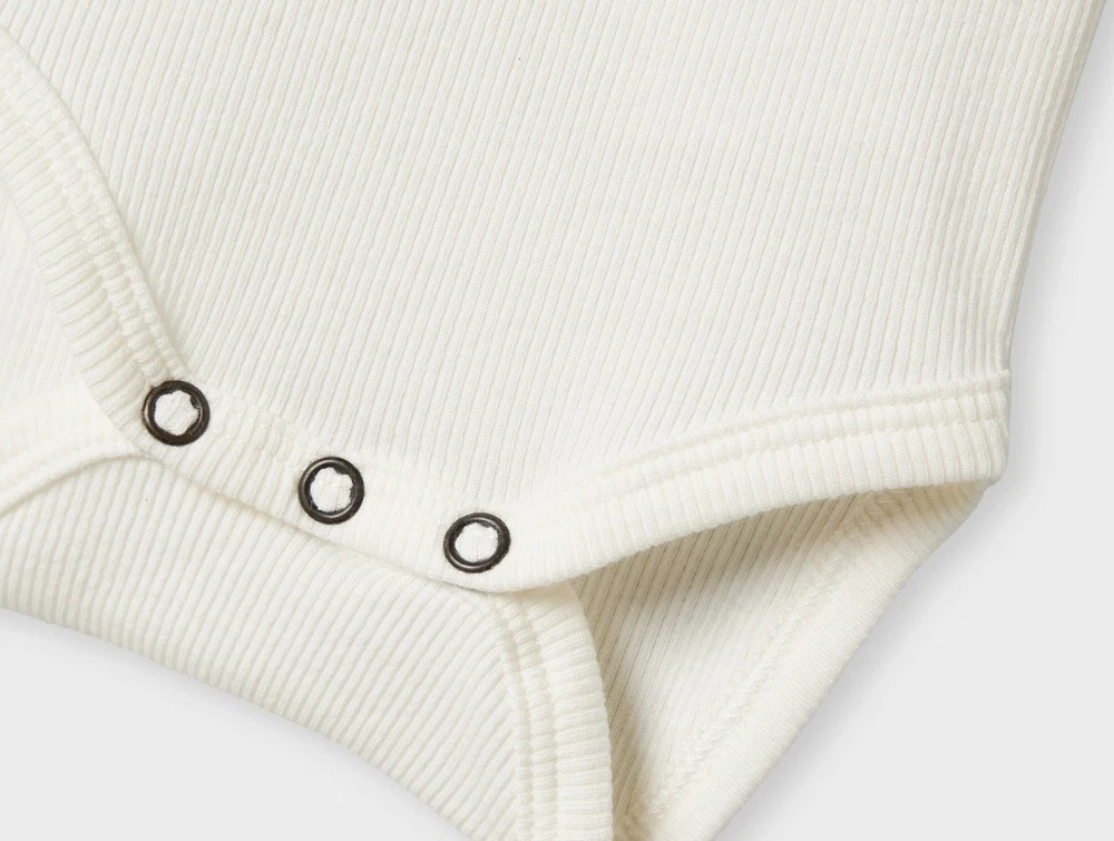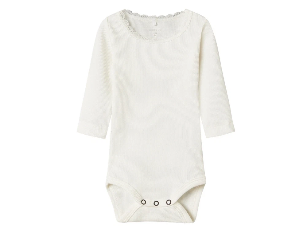 Langærmet body i råhvid nuance fra Name It. Bodyen har fin blondekant i halsudskæringen og praktisk trykknaplukning forneden.