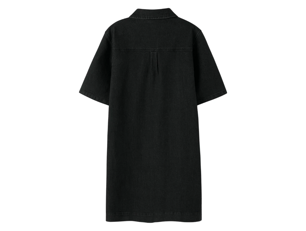 Denimkjole i mørk grå/sort nuance (dark grey denim) fra Name It med halvlange ærmer og praktiske brystlommer.