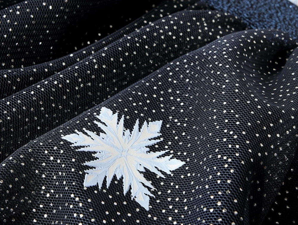 Materialet er en blød blanding med stræk, der gør kjolen behagelig at have på. Nederdelen har lag af tyl med glimmerdetaljer, der giver et festligt udtryk. Printet er lavet med gummidetaljer, der føles bløde mod stoffet.