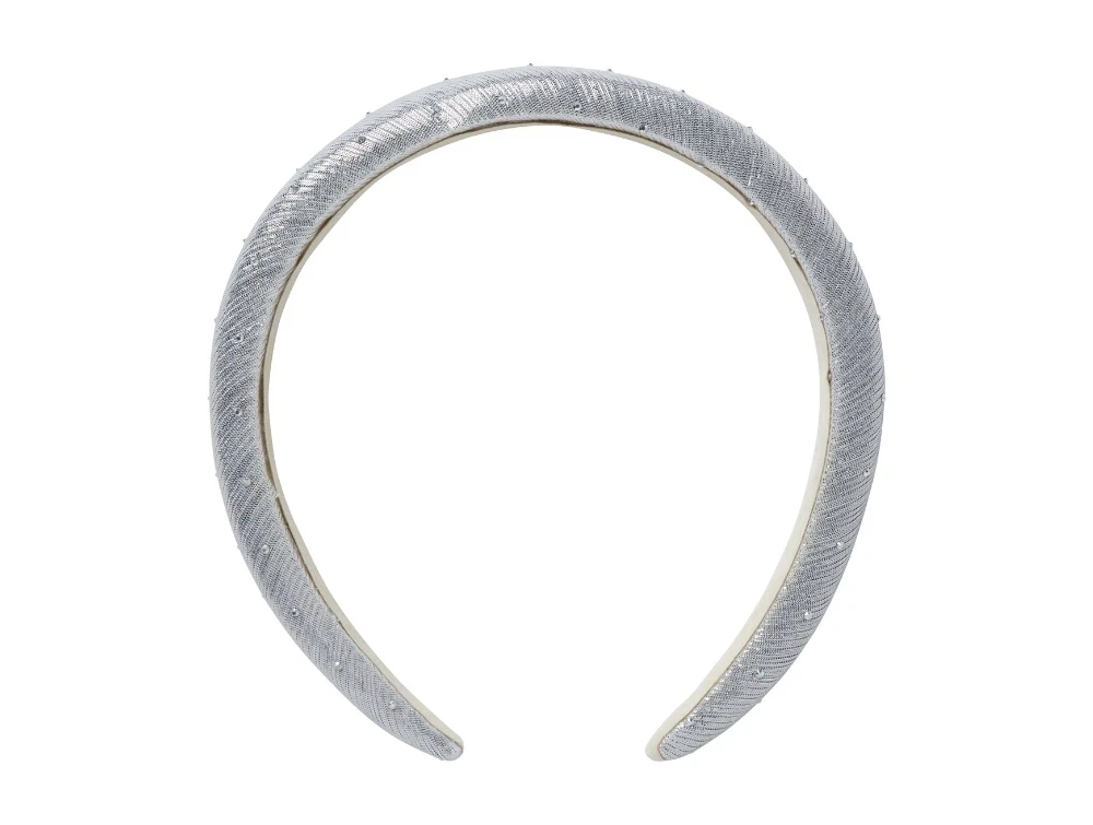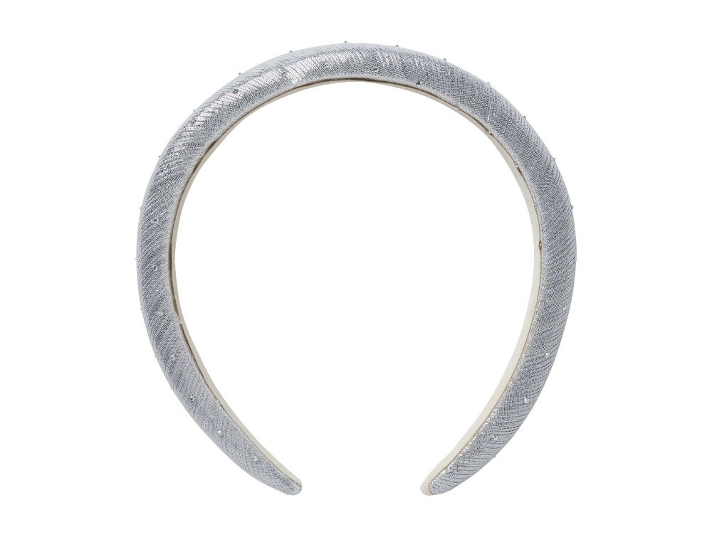 Den sølvfarvede hårbøjle har en let polstret form, som sidder behageligt på hovedet, og de små sten giver et elegant og festligt udtryk. En flot accessory, der kan bruges både til hverdag og særlige lejligheder.