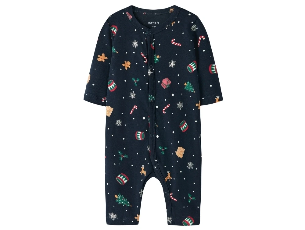 Natdragt i mørk blå nuance (navy blazer) fra Name It med all-over juleprint af rensdyr, trommer, juletræer og kagemænd.