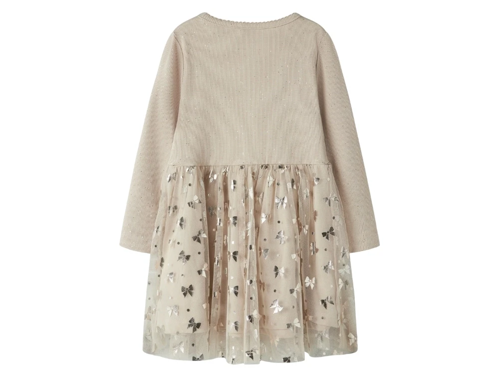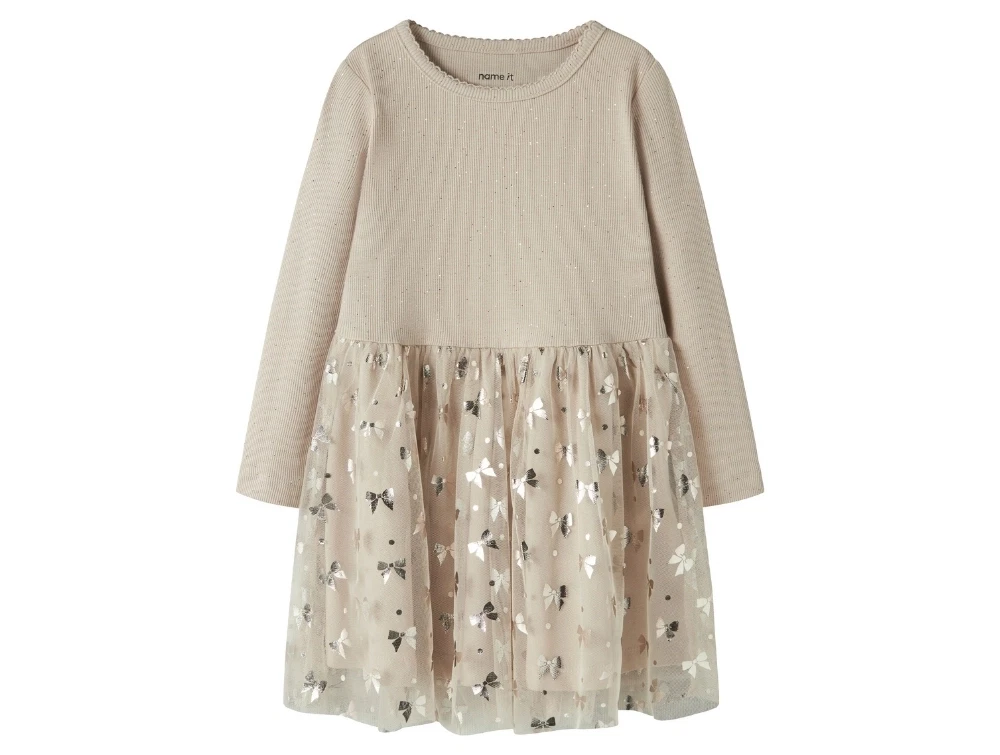Kjole i beige nuance (cement) fra Name It med ribstrikket overdel og tylskørt med glitrende sløjfer.