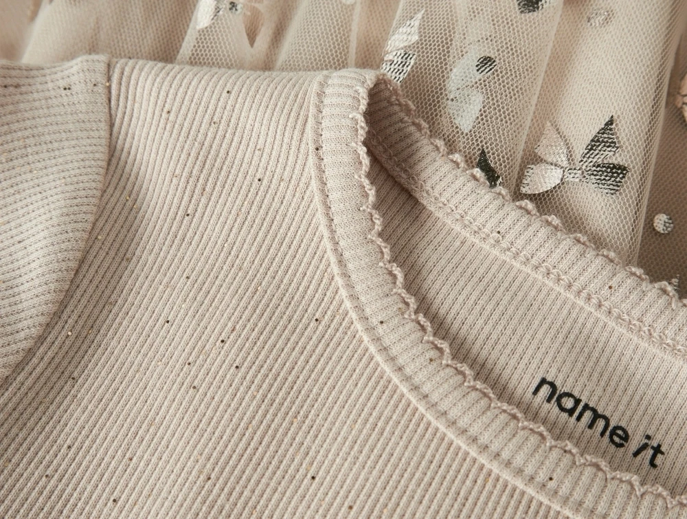 Name It kjole i cement med tylskørt og sløjferDetalje af ribstrikket overdel og tylskørt med sløjfer på cementfarvet kjole fra Name ItBagside af cementfarvet Name It kjole med tylskørt og glimmerdetaljer
