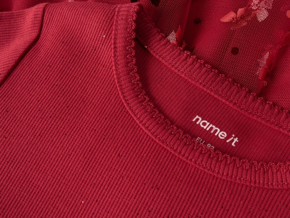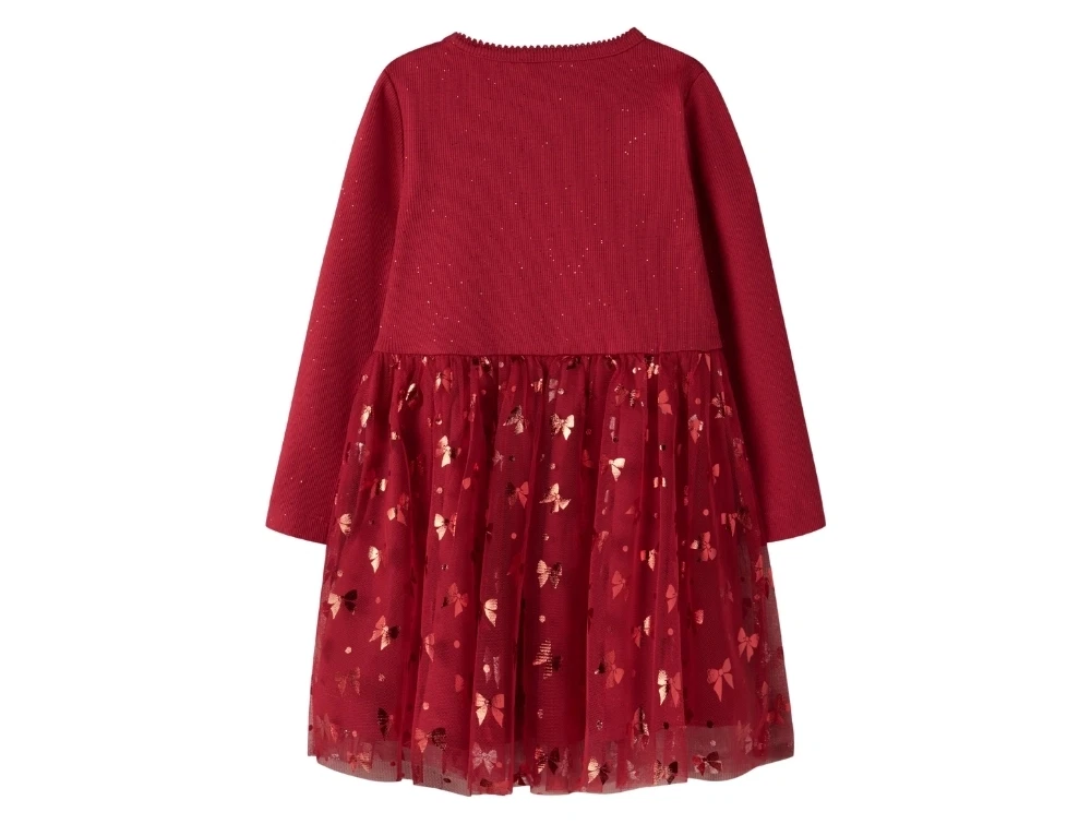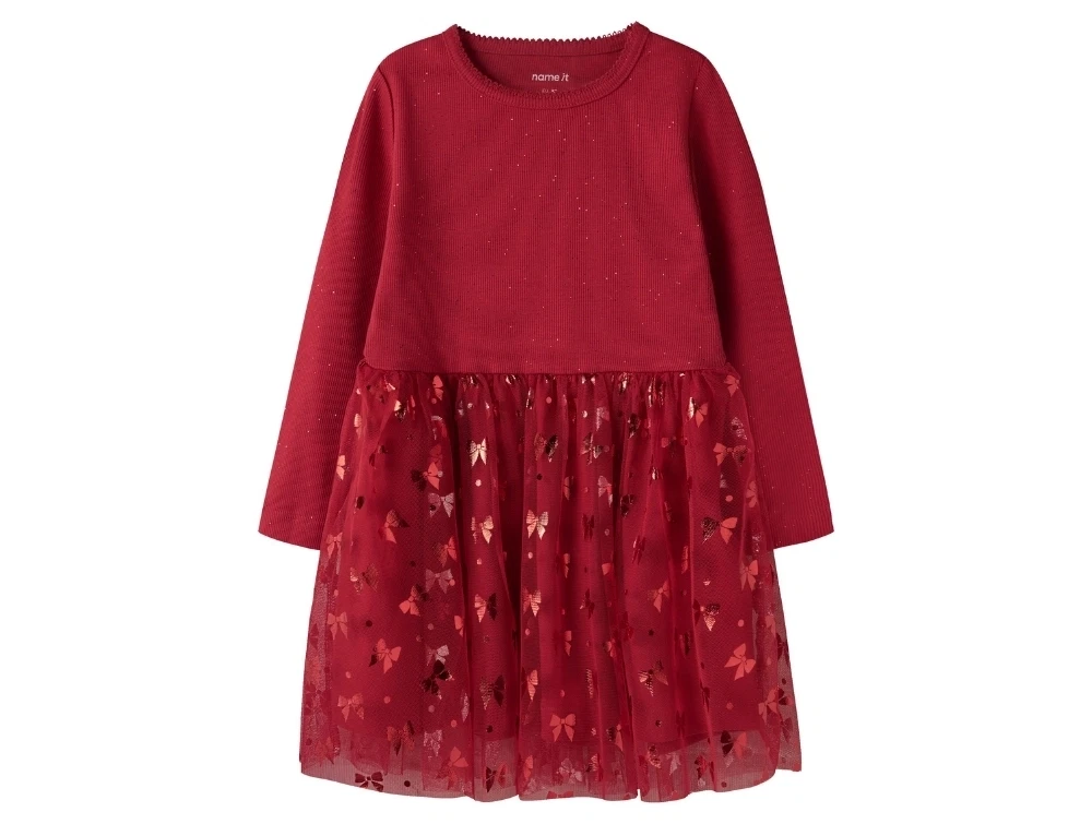 Kjole i rød nuance fra Name It med ribstrikket overdel og tylskørt med glitrende sløjfer.