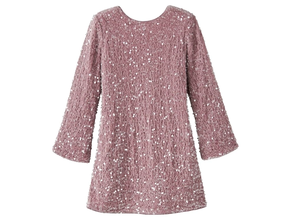 Kjole i lyserød nuance (keepsake lilac) fra Name It med lange ærmer og pailletter, der fanger lyset smukt.