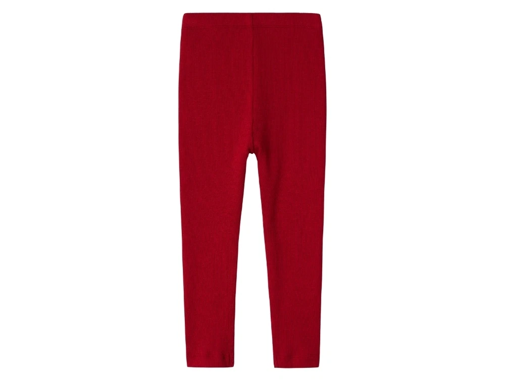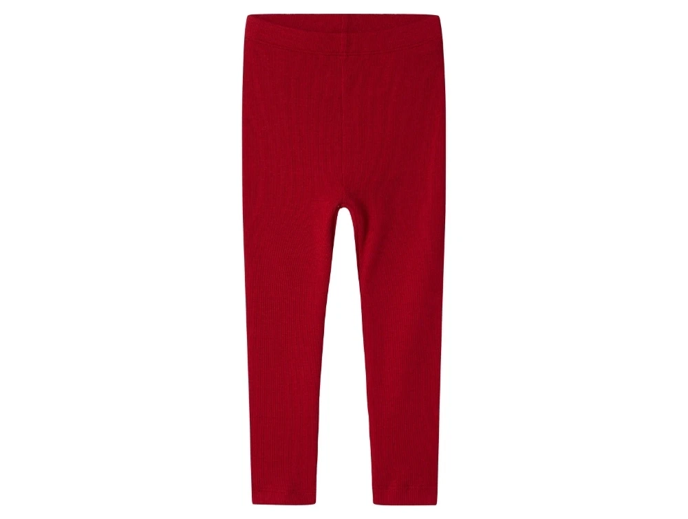Leggings i rød nuance (jester red) fra Name It med ribstruktur. Et enkelt og anvendeligt basisitem til hverdagen, perfekt til lag-på-lag eller under kjoler.