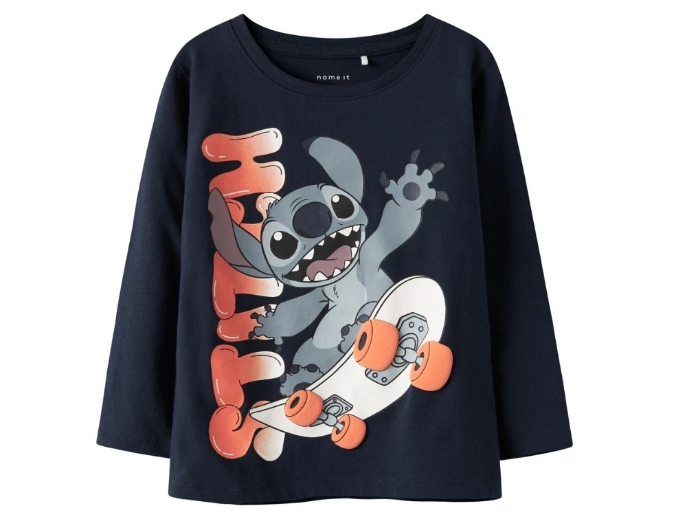 Langærmet t-shirt i mørkeblå nuance fra Name It med sejt print af Stitch fra Disney’s Lilo & Stitch. Blusen har rund hals og et print med gummi- og skumdetaljer, som giver en let 3D-effekt.