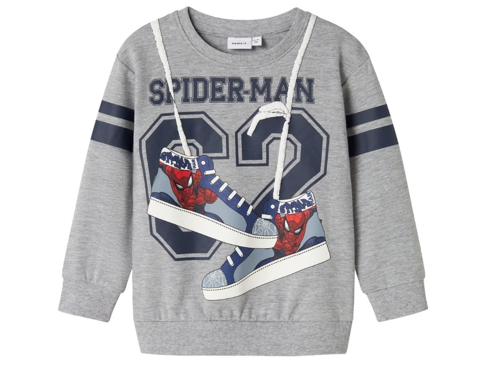 Sweatshirt i grå melange fra Name It med sejt Spiderman print foran. Trøjen har rund hals, ribkanter og dekorative snører foran, der giver et sporty udtryk. Det kombinerede gummi- og skumtryk skaber en flot 3D-effekt.