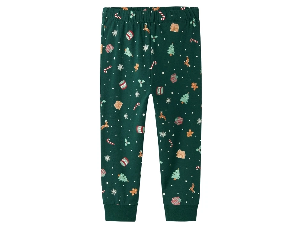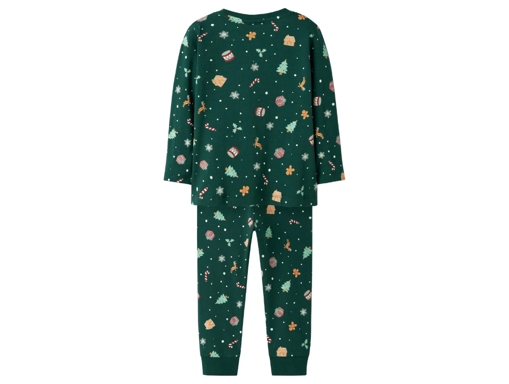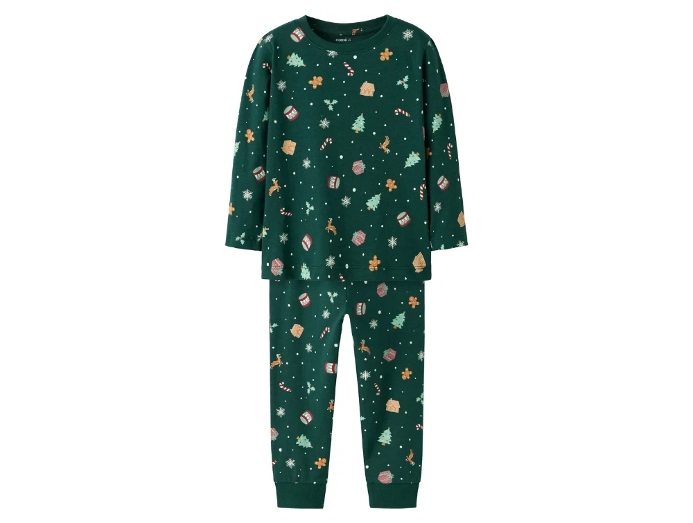 Pyjamas i grøn nuance (botanical garden) fra Name It med all-over juleprint af rensdyr, trommer, juletræer og kagemænd.