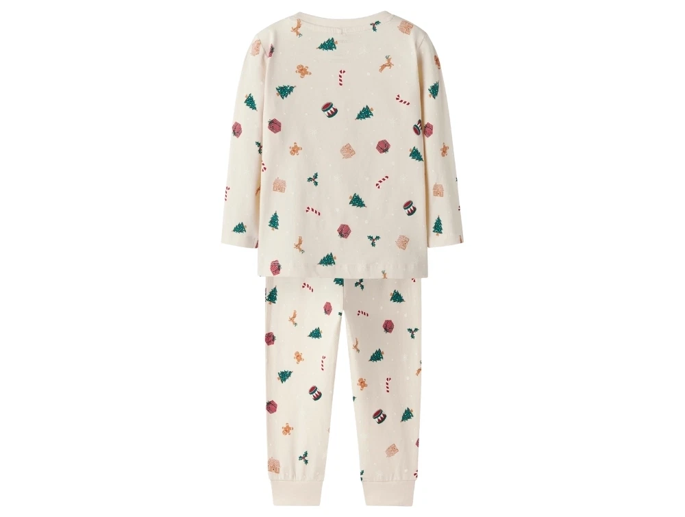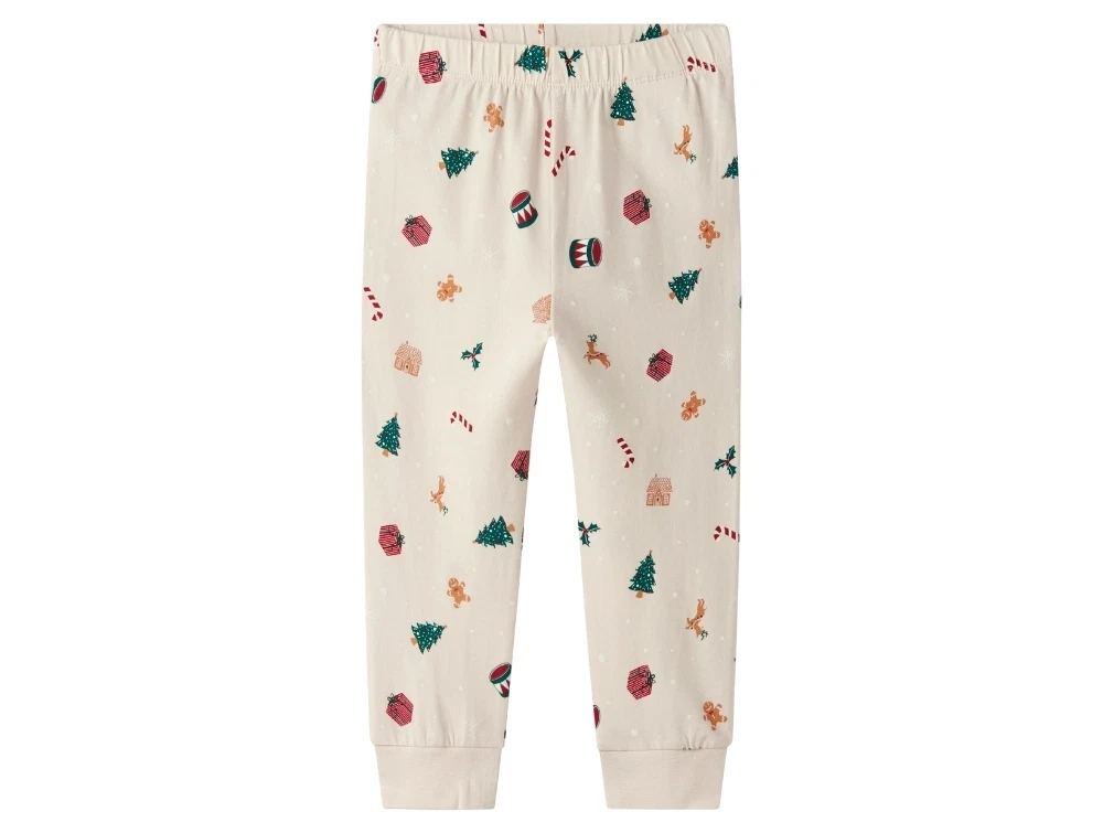 Pyjamas i råhvid nuance (whitecap gray) fra Name It med all-over juleprint af rensdyr, trommer, juletræer og kagemænd.