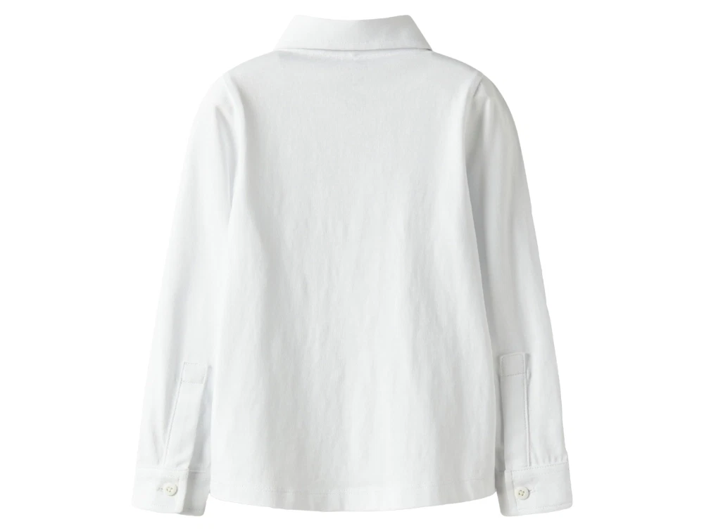 Name It skjorte i hvid med brystlommeBarn iført hvid Name It skjorte under blazerDetalje af knapper og brystlomme på hvid skjorte fra Name ItBagside af hvid Name It skjorte med lange ærmer