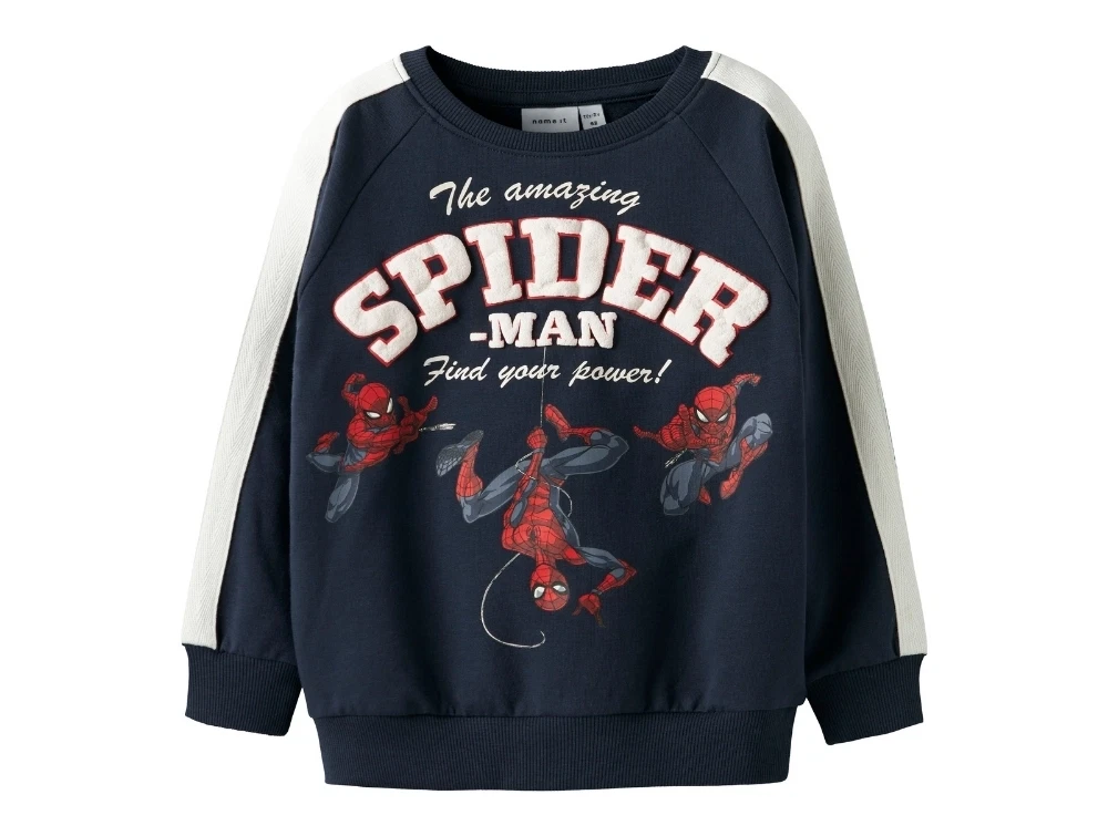 Name It Spiderman sweatshirt i navy med printDetalje af Spiderman print på navy sweatshirt fra Name ItBagside af navy Spiderman sweatshirt fra Name It
