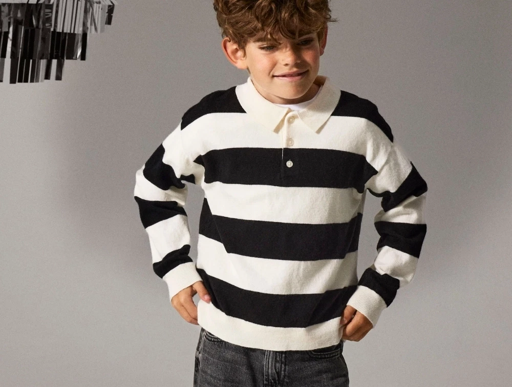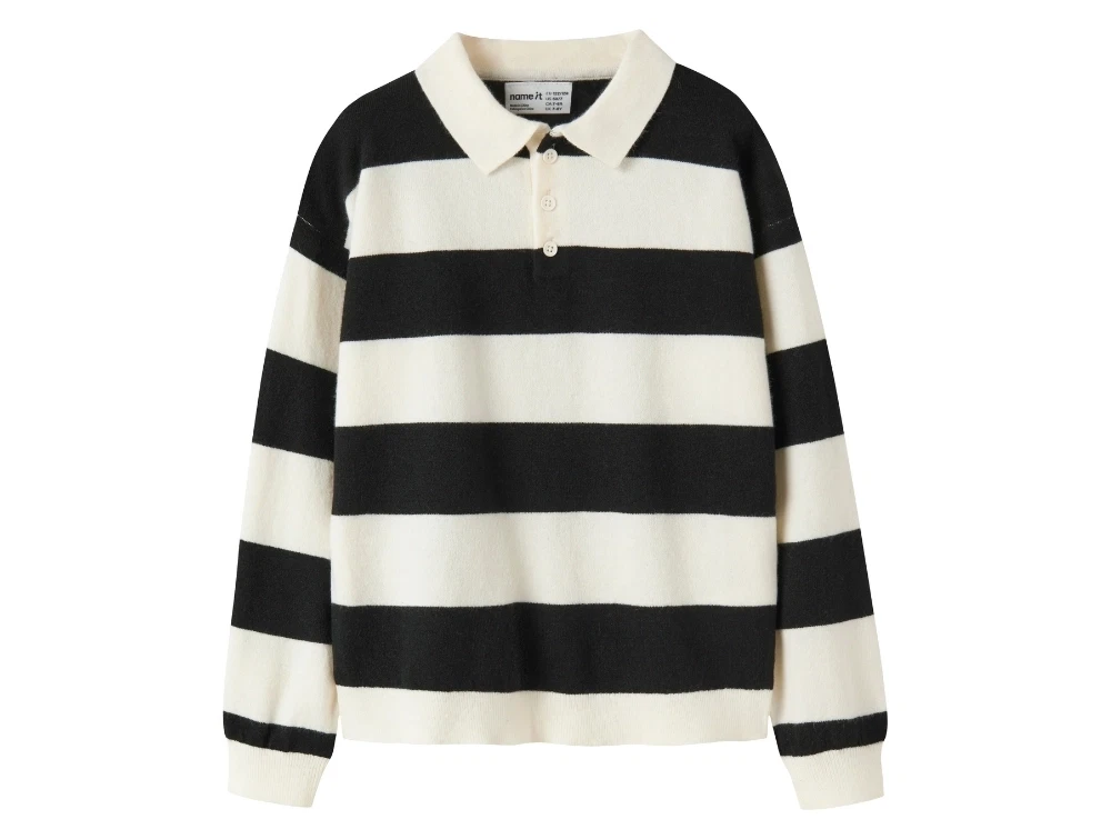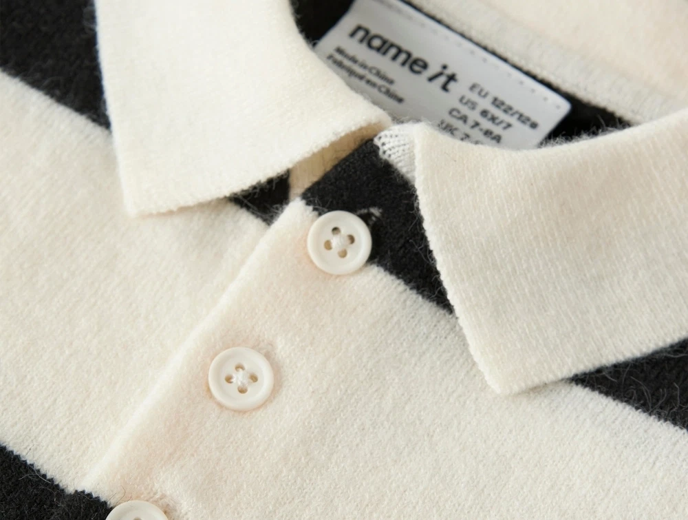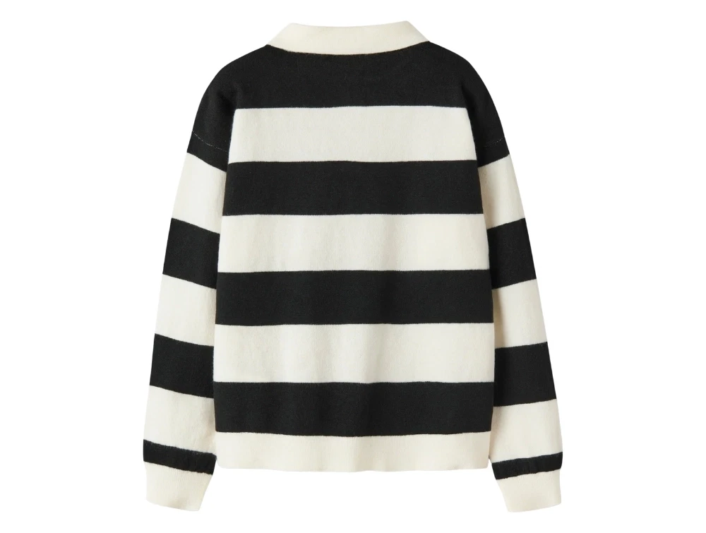 Name It strikpolo sort stribet forfraDetalje af knaplukning på Name It strikpoloDreng iført Name It strikpolo sort med hvide striberName It strikpolo sort stribet bagfra