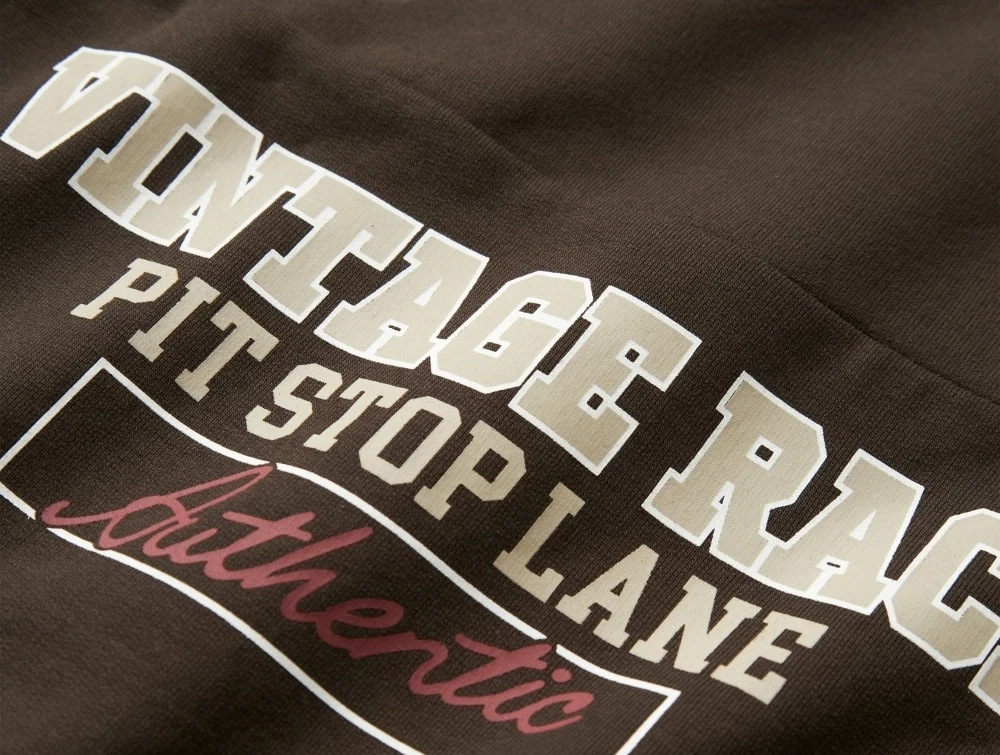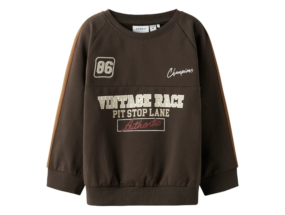 Name It sweatshirt i brunt med vintage race printDetalje af vintage race print på brun sweatshirt fra Name ItBagside af brun Name It sweatshirt uden print