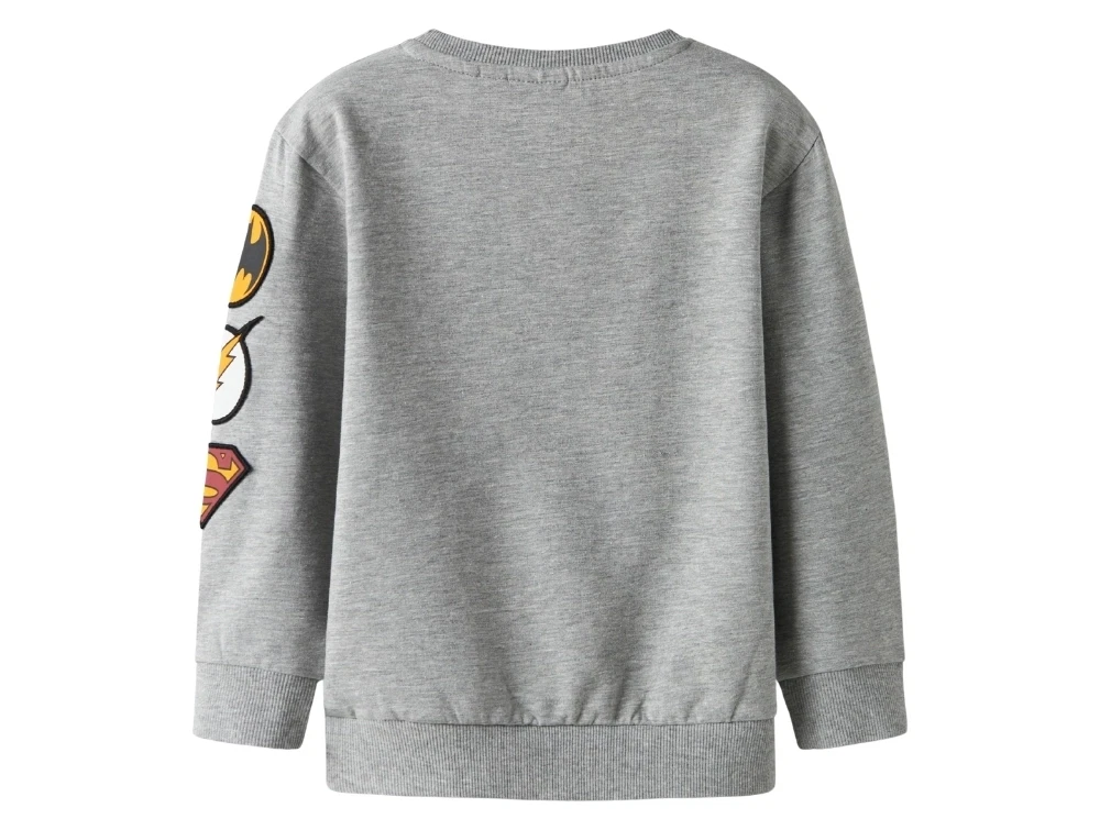 Name It sweatshirt i grå med superhelte printDetalje af superhelte print på grå sweatshirt fra Name ItBagside af grå Name It sweatshirt med badges på ærme