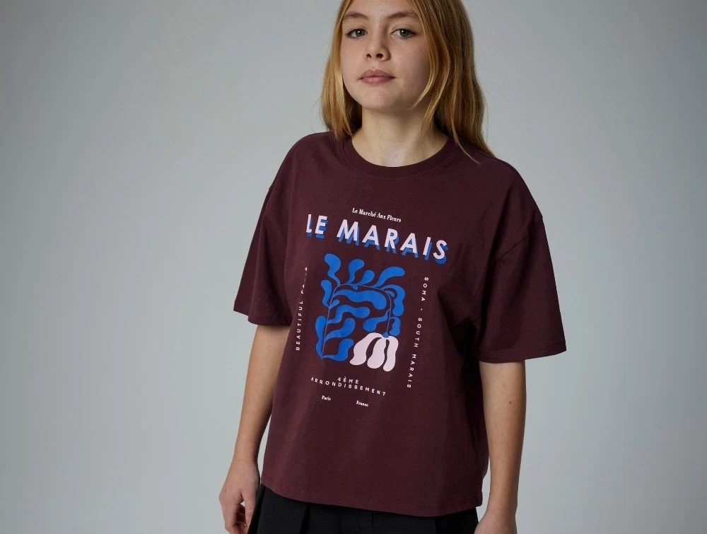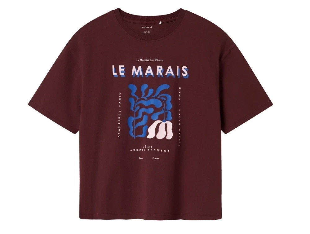 T-shirt i bordeaux rød nuance (sassafras) fra Name It med stort "Le Marais"-print foran i blå og hvide nuancer.
