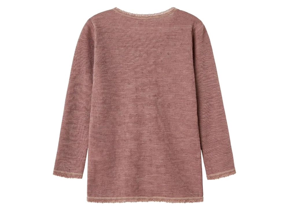 Name It bluse i støvet violet merinould med hulmønster og blondekant
