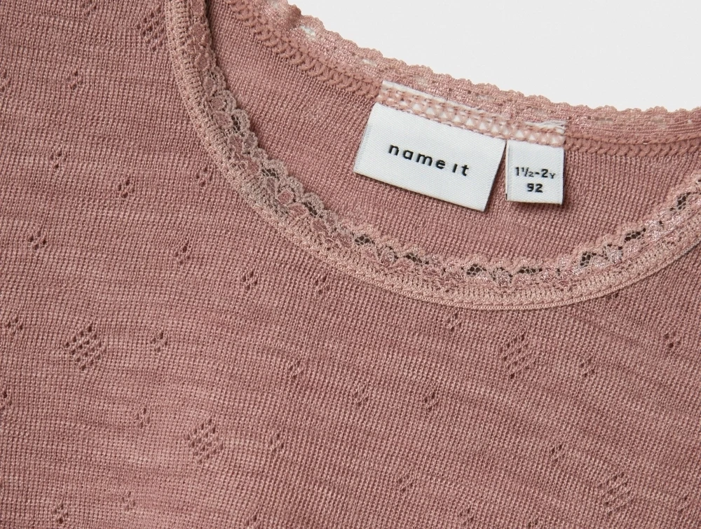 Mere information om Name It uld bluse antler i merinould med hulmønster og blondekant