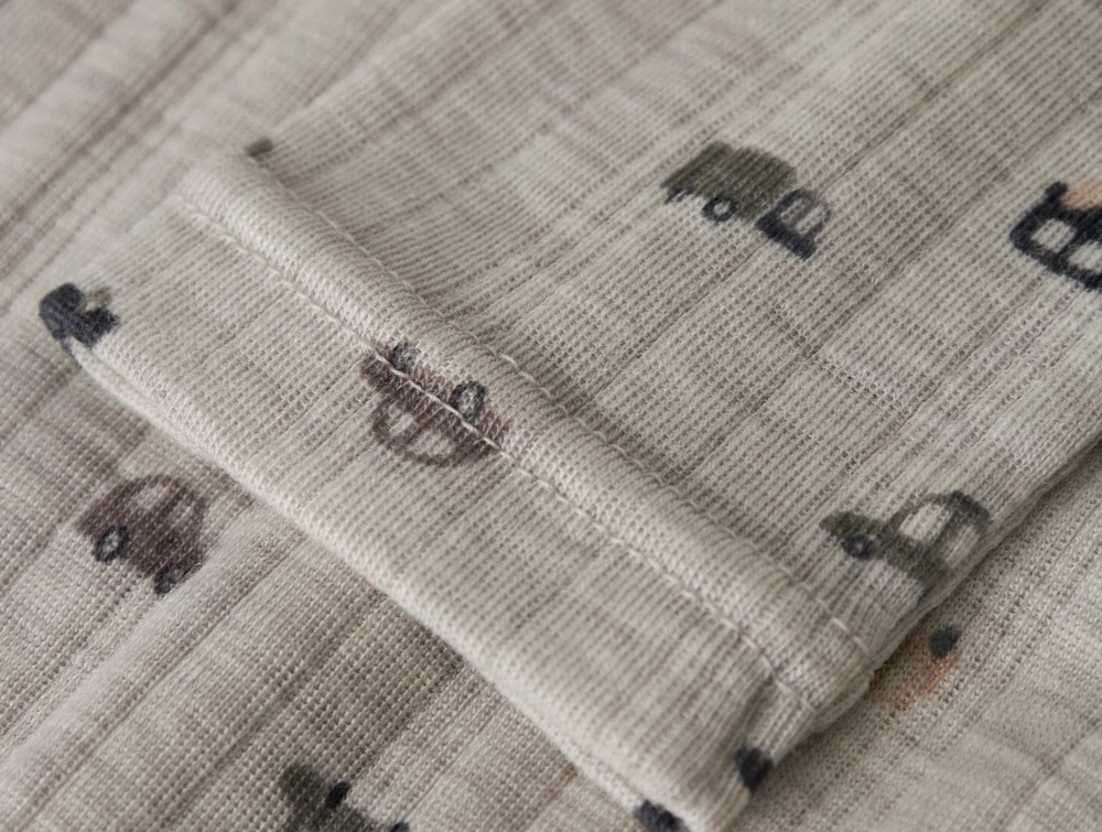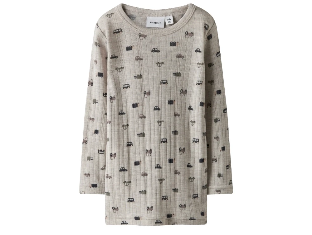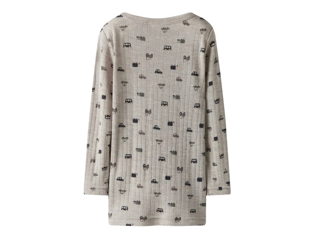 Name It bluse i lys grå merinould med ribmønster og bilprint