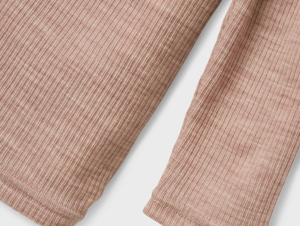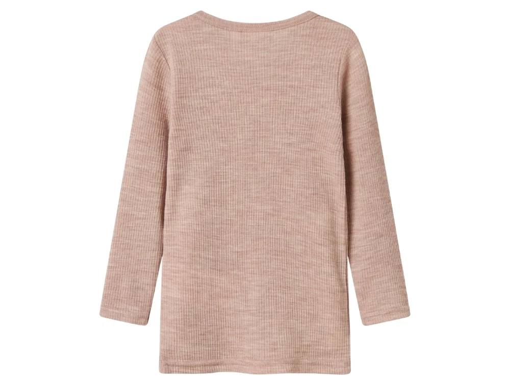 Pige iklædt Name It uld bluse i støvet rosa nuance shadow gray med ribstrukturName It uld bluse i støvet rosa nuance shadow gray med ribstrukturDetalje af Name It uld bluse i shadow gray med rund halsBagside af Name It uld bluse i støvet rosa nuance shadow gray