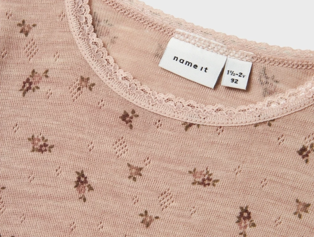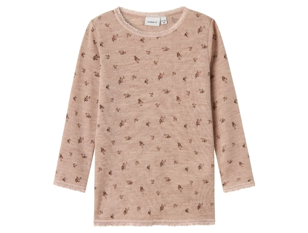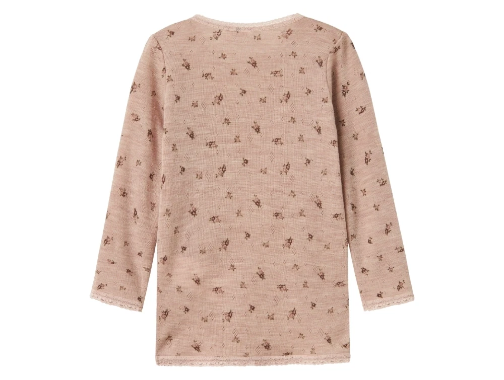 Name It bluse i støvet rosa merinould med blomsterprint og hulmønster