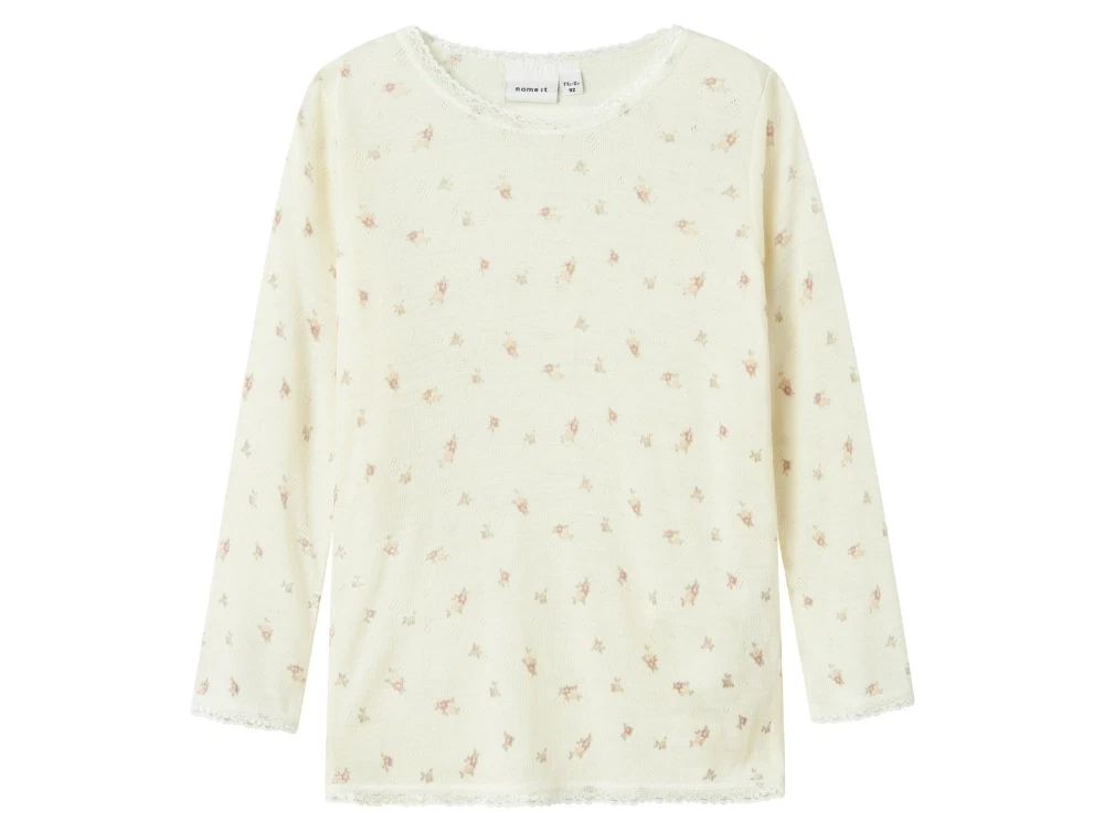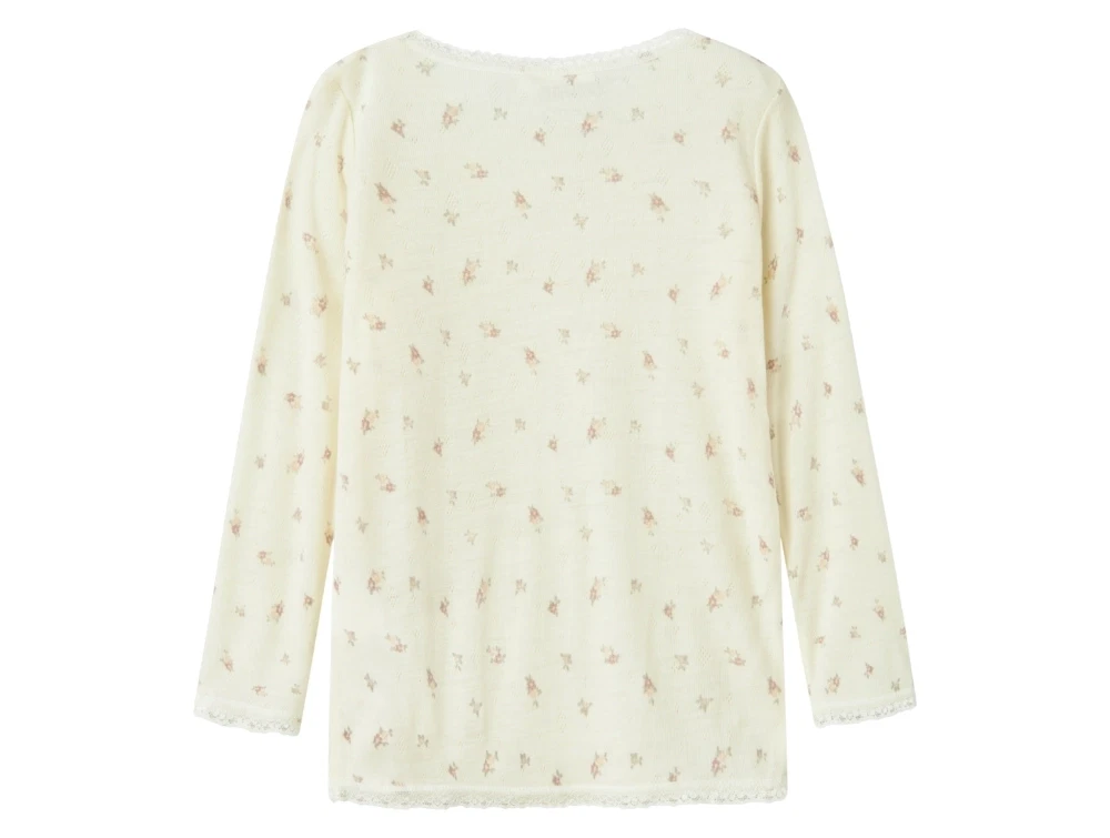 Name It bluse i råhvid merinould med blomsterprint og hulmønster