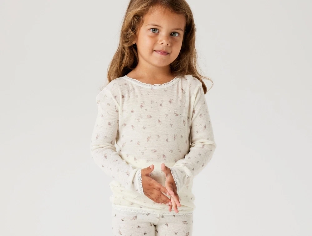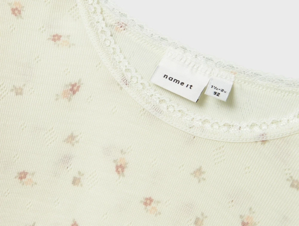Barn iført Name It uld bluse i snow white med blomsterprintName It uld bluse i snow white merinould med blomsterprint og hulmønsterDetalje af Name It uld bluse i snow white med blondekantBagside af Name It uld bluse i snow white med blomsterprint og hulmønster