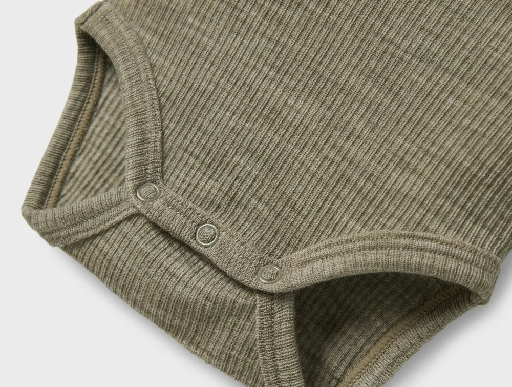 Baby iført Name It uld body i dried sageName It uld body i dried sage merinould med ribstrukturDetalje af Name It uld body i dried sage med trykknapperBagside af Name It uld body i dried sage merinould