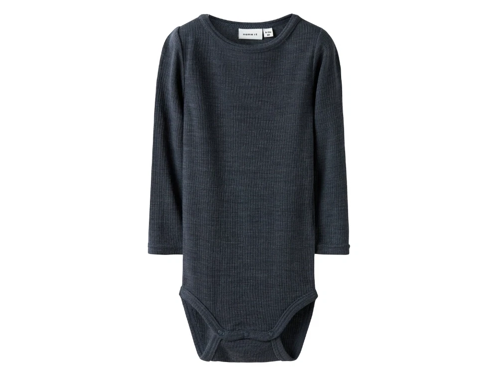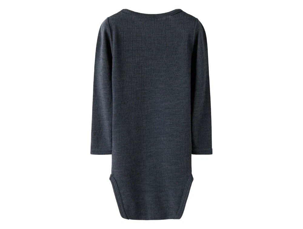 Den langærmede body er fremstillet i blød merinould med ribstruktur, som giver et enkelt og tidløst design. Trykknapper forneden gør den nem at anvende i hverdagen.