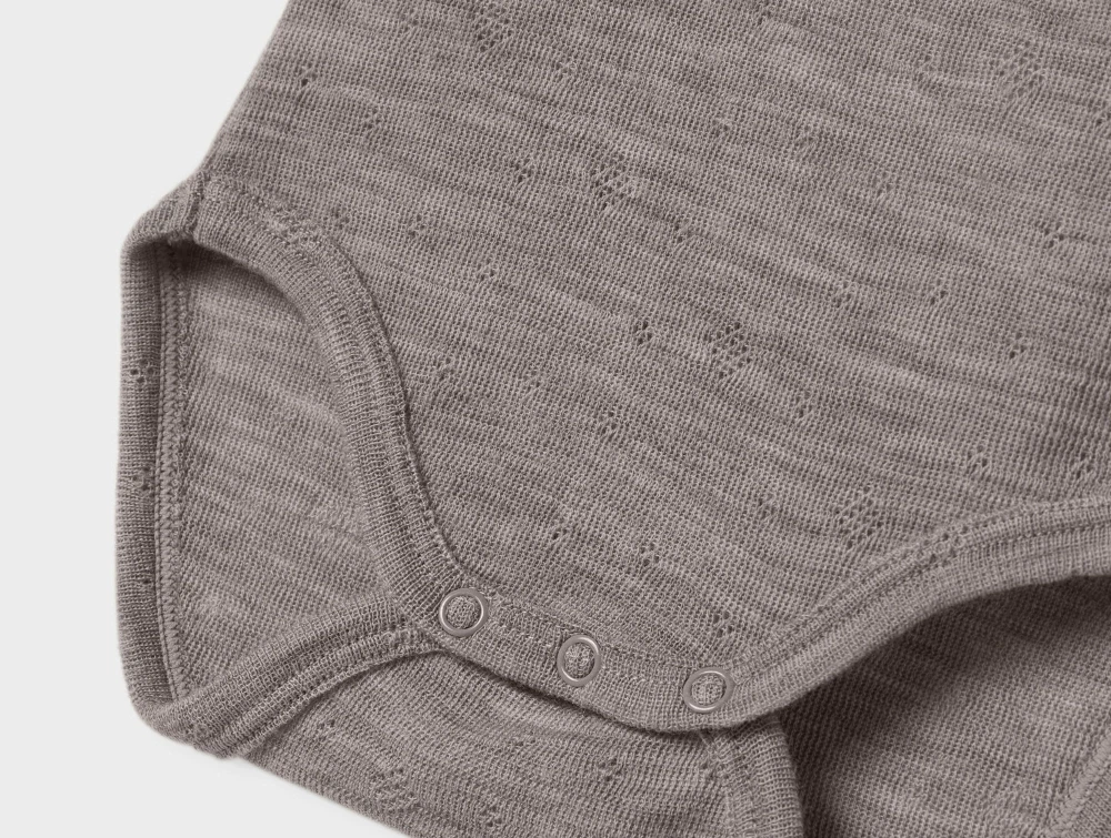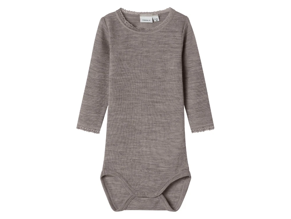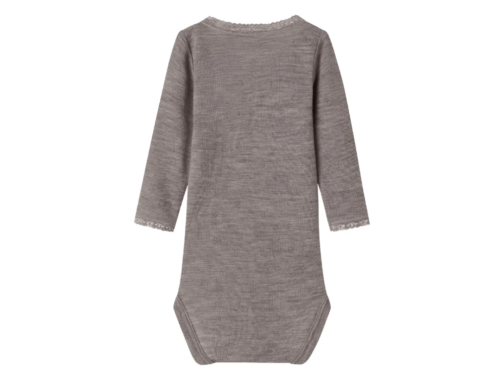 Name It body i grå-brun merinould med hulmønster og blondekant