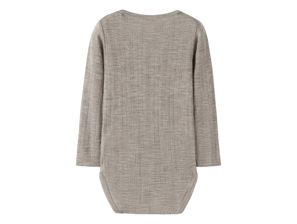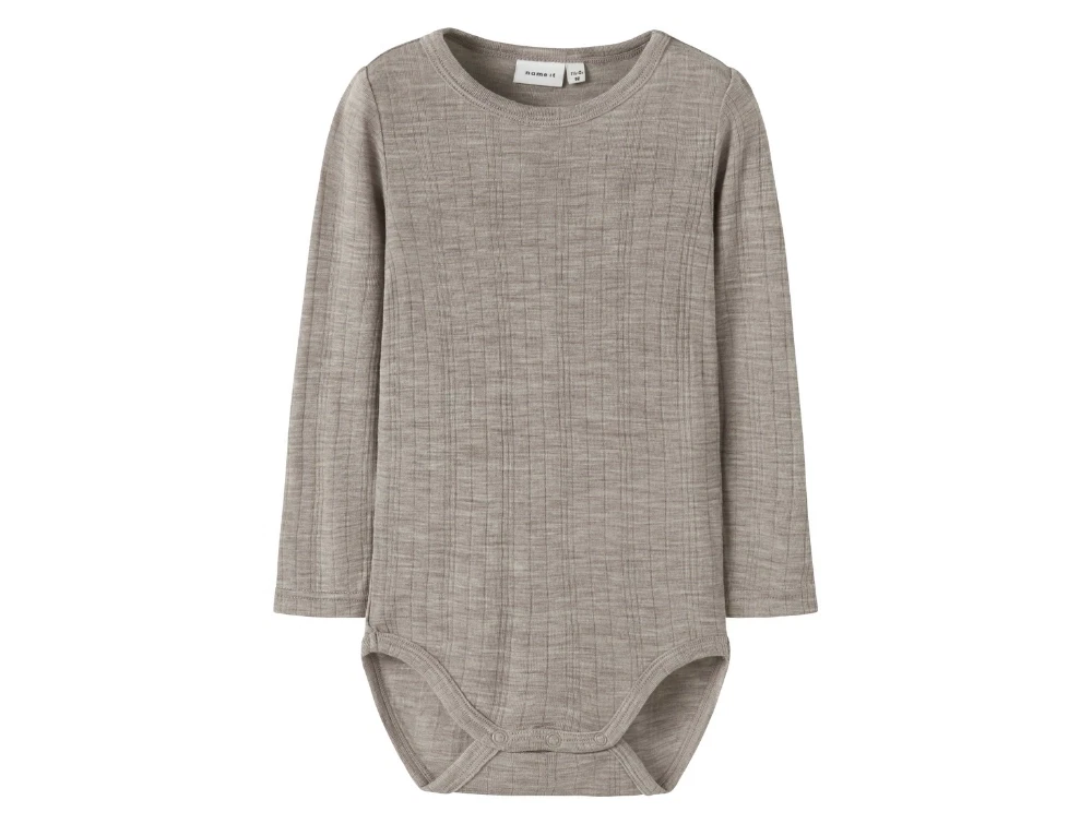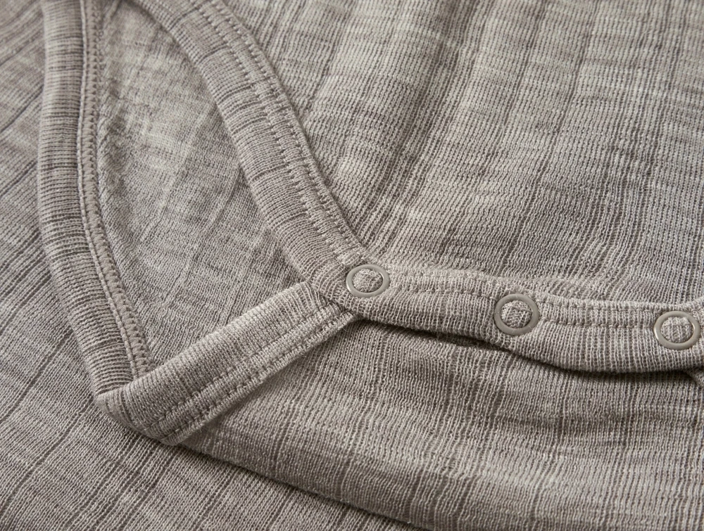 Denne langærmede body er fremstillet i blød merinould med ribstruktur, som giver et klassisk og tidløst udtryk. Trykknapper forneden gør det nemt at skifte.