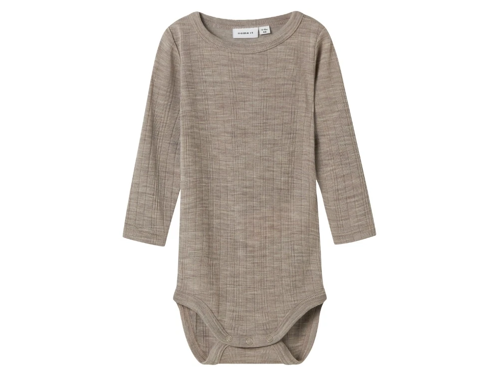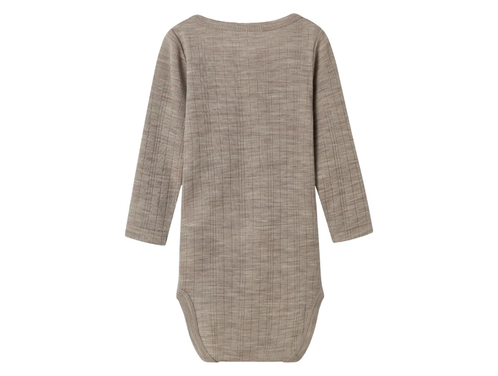 Denne langærmede body er strikket i blød merinould med ribstruktur, som giver et enkelt og tidløst look. Trykknapper forneden gør den let at anvende i hverdagen.