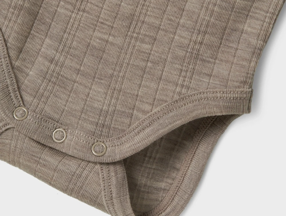 Name It uld body i satellite merinould med ribstrukturDetalje af Name It uld body i satellite med trykknapperBagside af Name It uld body i satellite merinould