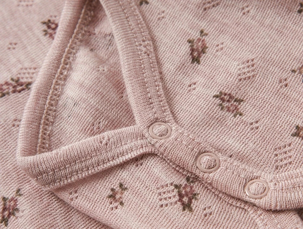 Bodyen er fremstillet i blød merinould med pointelle-struktur og fine blondedetaljer ved hals og ærmer. Trykknapper i bunden gør det nemt at skifte.