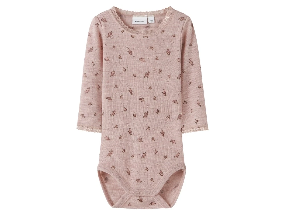 Mere information om Name It body shadow gray med blomsterprint og blondekant i merinould