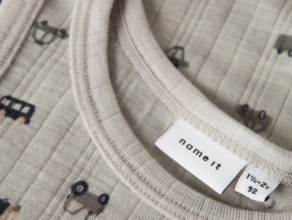Name It uld undertrøje i nacreous cloud merinould med bilprintDetalje af Name It uld undertrøje i nacreous cloud med ribstrukturBagside af Name It uld undertrøje i nacreous cloud med bilprint