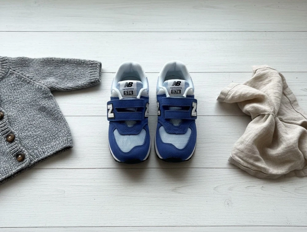 Rummelig sneaker i blå nuance fra New Balance med to velcroremme, der gør skoen nem at tage af og på. 574 er en af brandets mest ikoniske modeller og er her fortolket i en børneudgave med fokus på komfort og hverdagsbrug.
