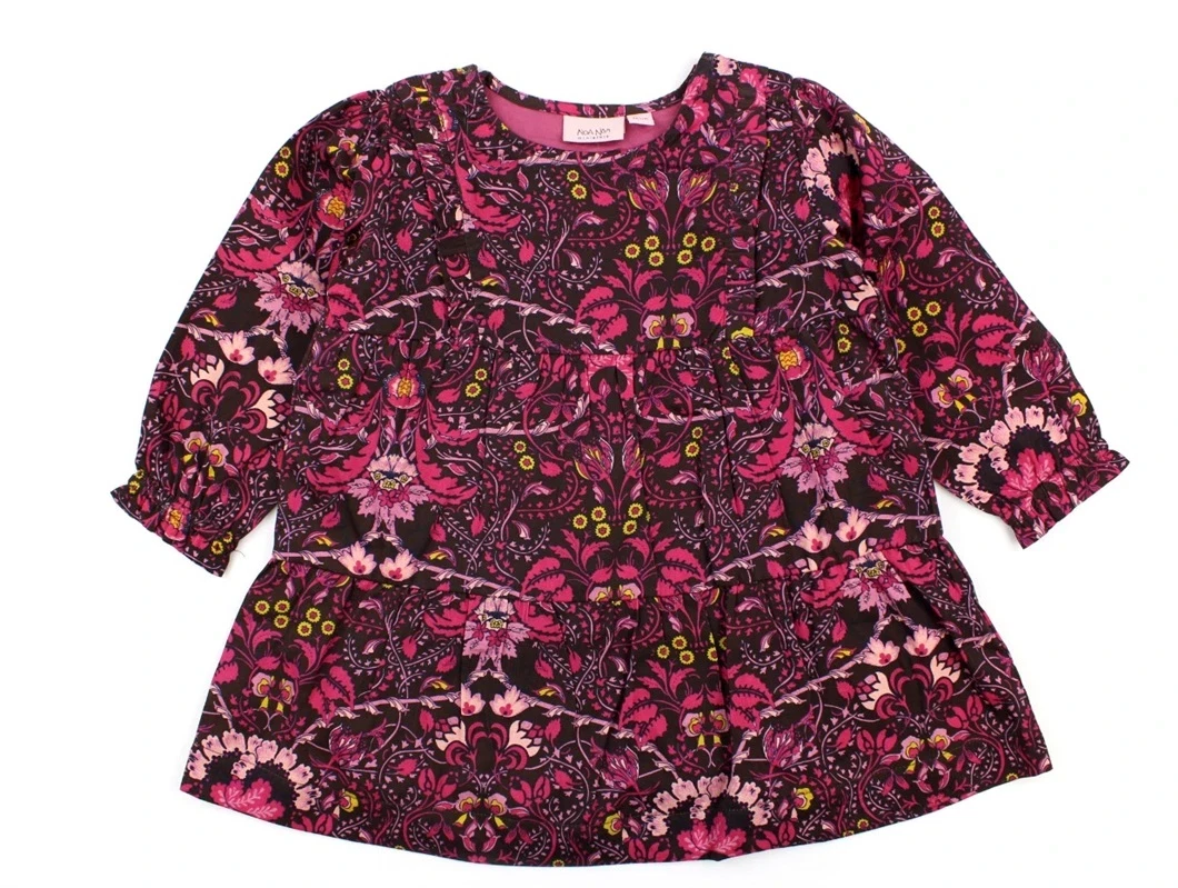 Brun kjole med blomsterprint og trykknapper ved skulder fra Noa Noa Miniature.