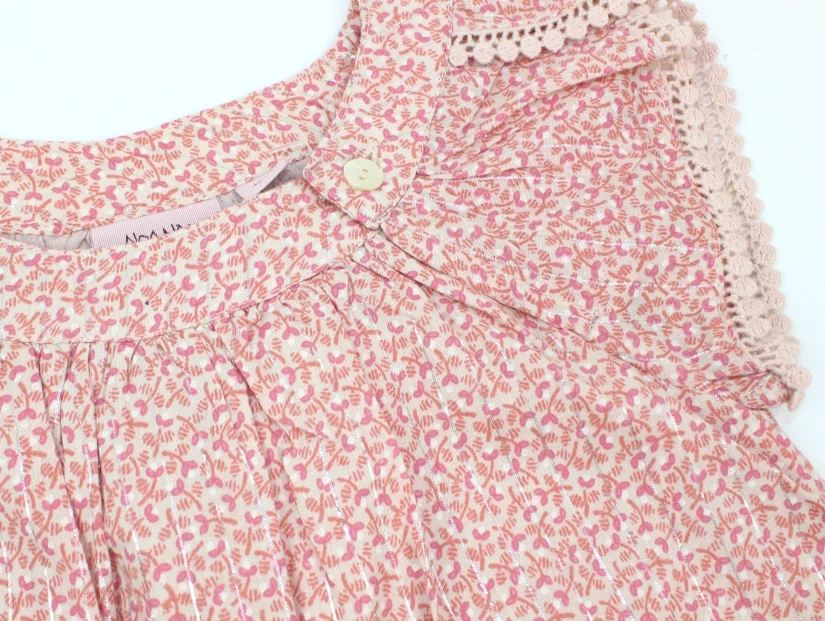 Kortærmet kjole i farven hushed violet med print og fine detaljer fra Noa Noa Miniature. Kjolen har en tynd underkjole indvendigt.