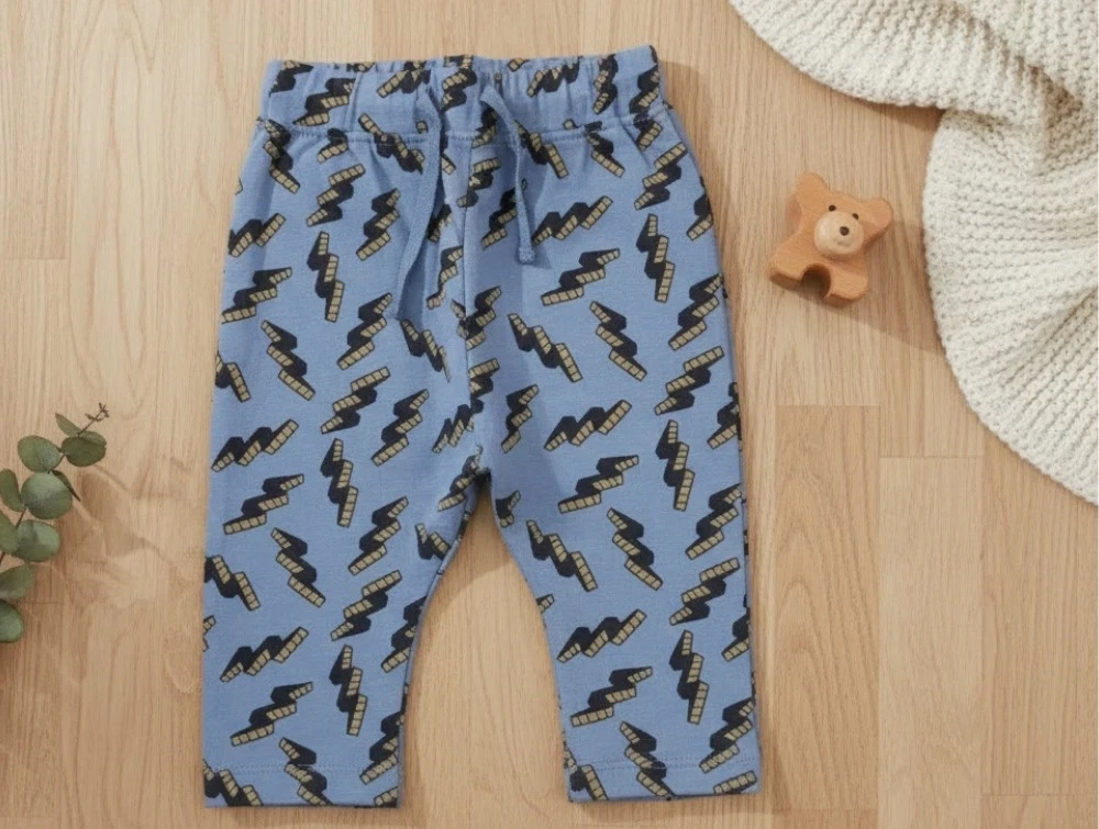 Blå bukser med print af lyn fra Petit by Sofie Schnoor. Bukserne har elastik i taljen.