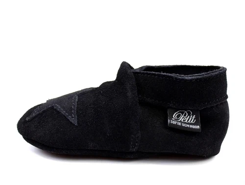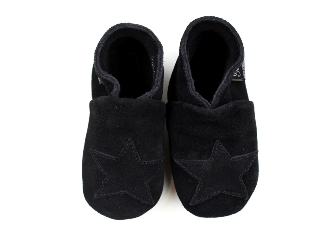 Sorte hjemmesko i ruskind med stjerneapplikation fra Petit by Sofie Schnoor. Hjemmeskoene har en tynd sål af ruskind.