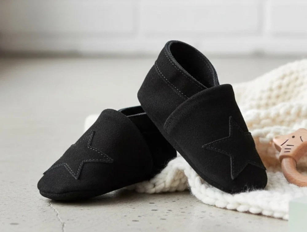 Sorte hjemmesko i ruskind med stjerneapplikation fra Petit by Sofie Schnoor. Hjemmeskoene har en tynd sål af ruskind.